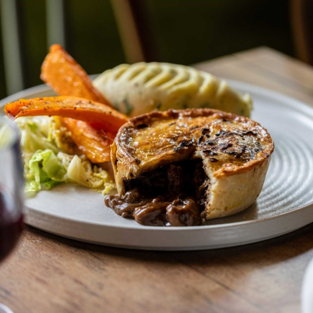 Mushroom bourguignon pie, roast potatoes, green cabbage, peas, leeks, roasted carrots, gravy (ve) | 14.95 1057 kcals